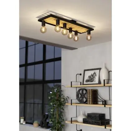 Beschreibung Eglo Deckenleuchte Consett Stahl Holz Schwarz Braun | IP20 - Geeignet für 6x E27