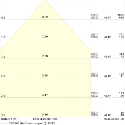 Der Abstrahlwinkel bezeichnet den Winkel, in dem das Licht aus der Lichtquelle ausgestrahlt wird. Er wird in Grad (D) angegeben. Je geringer die Gradzahl des Abstrahlwinkels ist, desto kleiner ist auch der Durchmesser des Lichtkegels, den die Lichtquelle produziert. Beispiel: Wird eine Lampe mit einem Abstrahlwinkel von 60 Grad an der Decke (2,5 m Höhe) angebracht, erzeugt sie einen Lichtkegel von 2,9 Metern Durchmesser. Hat die Lampe hingegen einen Abstrahlwinkel von 120 Grad, beträgt der Lichtkegel 8,7 Meter im Durchmesser. |