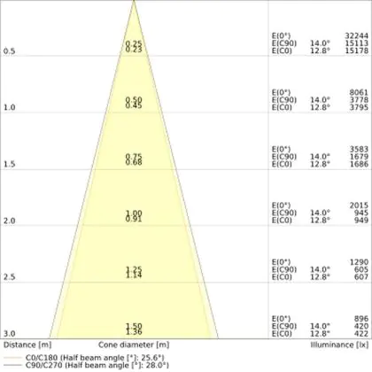 Der Abstrahlwinkel bezeichnet den Winkel, in dem das Licht aus der Lichtquelle ausgestrahlt wird. Er wird in Grad (D) angegeben. Je geringer die Gradzahl des Abstrahlwinkels ist, desto kleiner ist auch der Durchmesser des Lichtkegels, den die Lichtquelle produziert. Beispiel: Wird eine Lampe mit einem Abstrahlwinkel von 60 Grad an der Decke (2,5 m Höhe) angebracht, erzeugt sie einen Lichtkegel von 2,9 Metern Durchmesser. Hat die Lampe hingegen einen Abstrahlwinkel von 120 Grad, beträgt der Lichtkegel 8,7 Meter im Durchmesser. |