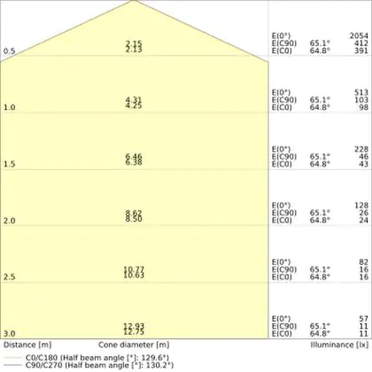 Der Abstrahlwinkel bezeichnet den Winkel, in dem das Licht aus der Lichtquelle ausgestrahlt wird. Er wird in Grad (D) angegeben. Je geringer die Gradzahl des Abstrahlwinkels ist, desto kleiner ist auch der Durchmesser des Lichtkegels, den die Lichtquelle produziert. Beispiel: Wird eine Lampe mit einem Abstrahlwinkel von 60 Grad an der Decke (2,5 m Höhe) angebracht, erzeugt sie einen Lichtkegel von 2,9 Metern Durchmesser. Hat die Lampe hingegen einen Abstrahlwinkel von 120 Grad, beträgt der Lichtkegel 8,7 Meter im Durchmesser. |