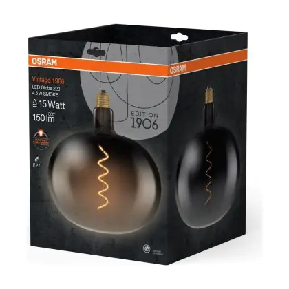 Die Osram Vintage 1906 LED Classic Globe LED E27 Special Fadenlampe Smoke 4.5W 150lm - 818 Extra Warmweiß | Ersatz Für 15W ist eine effiziente E27 LED-Lampe mit Retrodesign und der perfekte Ersatz für Ihre konventionellen 15W Lampen mit E27. Zudem strahlt sie Licht in der Farbtemperatur 1800K - Extra Warmweiß aus und punktet durch eine lange Lebensdauer.