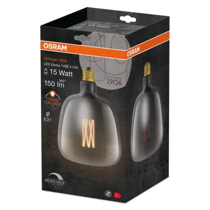 Die Osram Vintage 1906 LED E27 Special Filament Smokey Clear 4.5W 150lm - 816 Extra Warm White | Dimmable ist eine effiziente E27 LED-Lampe mit Retrodesign und der perfekte Ersatz für Ihre konventionellen 15W Lampen mit E27. Zudem strahlt sie Licht in der Farbtemperatur 1600K - Extra Warmweiß aus und punktet durch eine lange Lebensdauer.