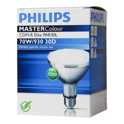 Die Philips CDM-R Elite 70W 930 E27 PAR30L 30D (MASTERColour) Lampen haben den Vorteil einer hohen Lichtqualiät und einen Farbwiedergabeindex von 90-100Ra. Das Licht ist warmweiß (3000K).