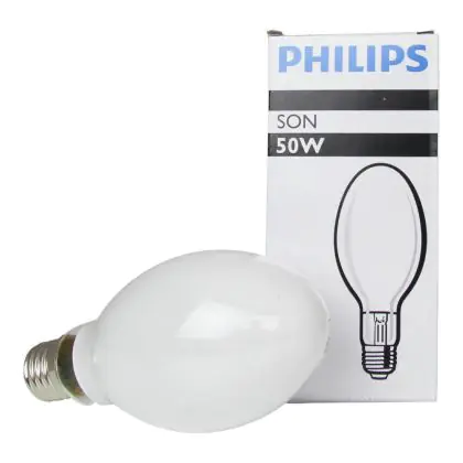 Philips SON Lampen sind Natriumdampf-Entladungslampen. Dies sind die sparsamen Standard Modelle. Sie bieten eine Lichtstrahlung von 130lm/W dank einer mit einem Gemisch aus Natrium, Quecksilber und Xenongas gefüllten Entladungsröhre. Philips SON 50W 220 I E27 Glühbirnen haben einen E27 Lampensockel und einen Durchmesser von 71mm.
